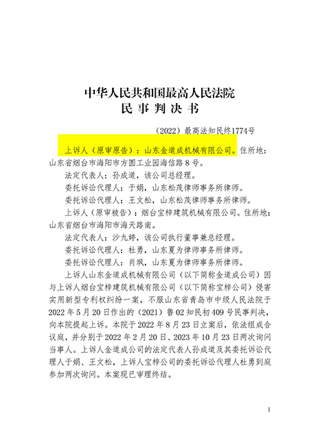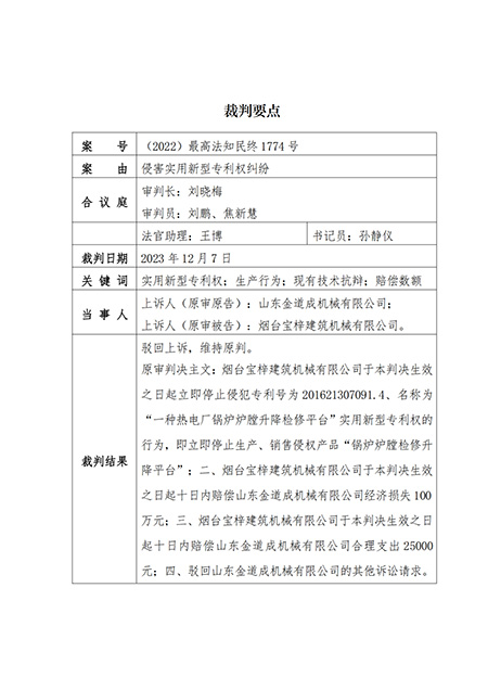 山東金道成機械有限公司于2021年11月26日立案起訴煙臺寶梓建筑機械有限公司侵犯“鍋爐爐膛檢修升降平臺”的專利權(quán)一案,經(jīng)過一審、二審法院2年零11天的審查,于2023年12月07日,中華人民共和國最高人民法院做出(2022)最高法知民終1774號的終審判決: